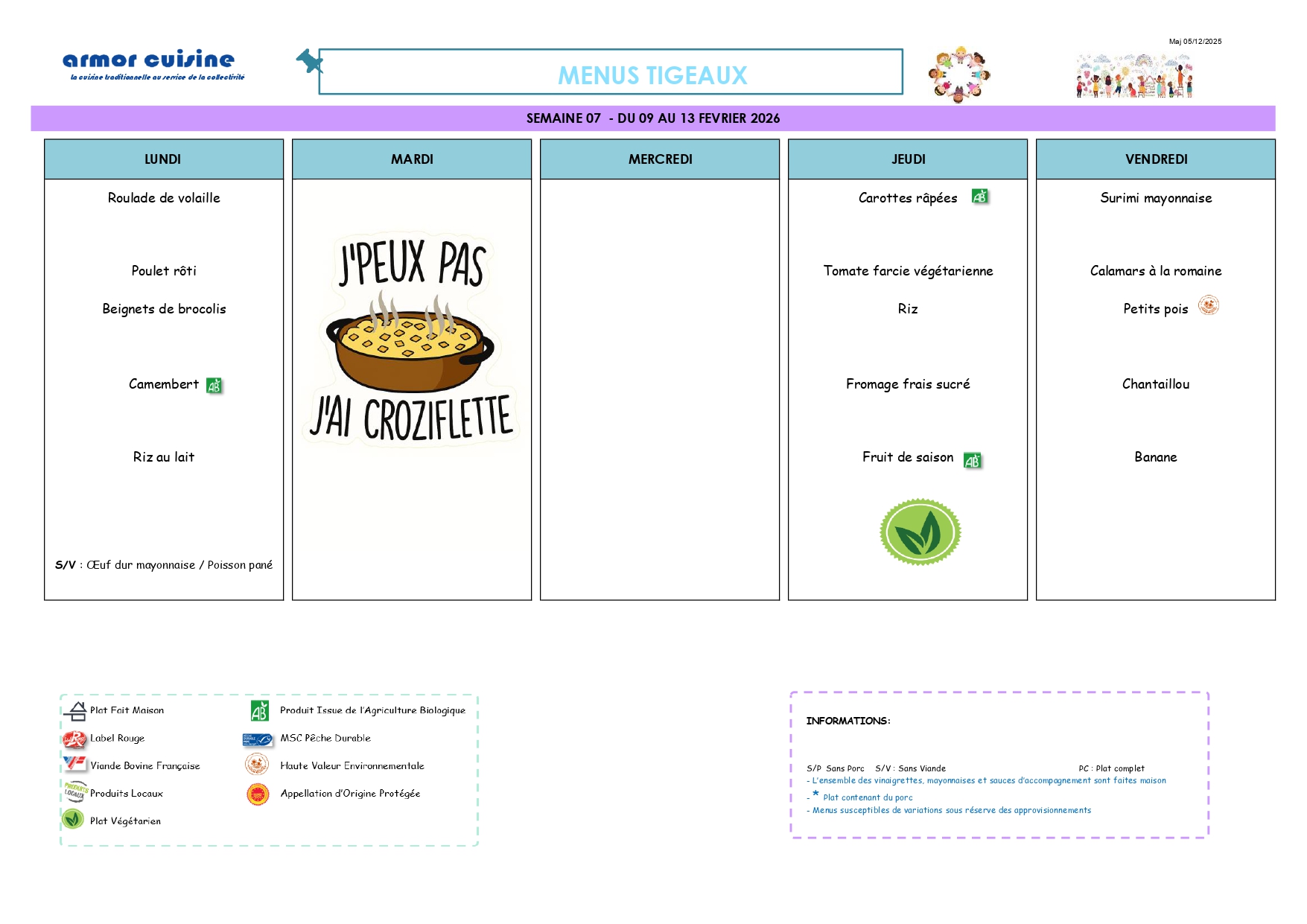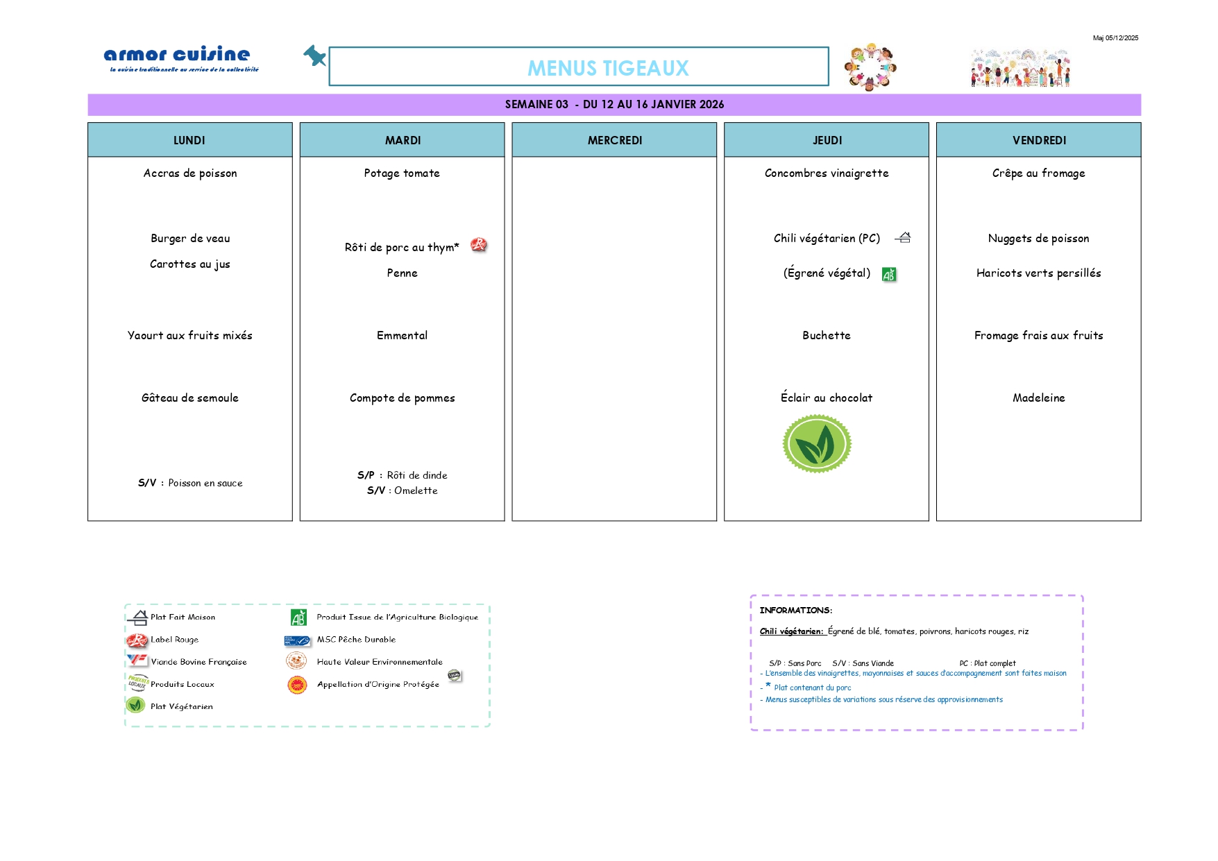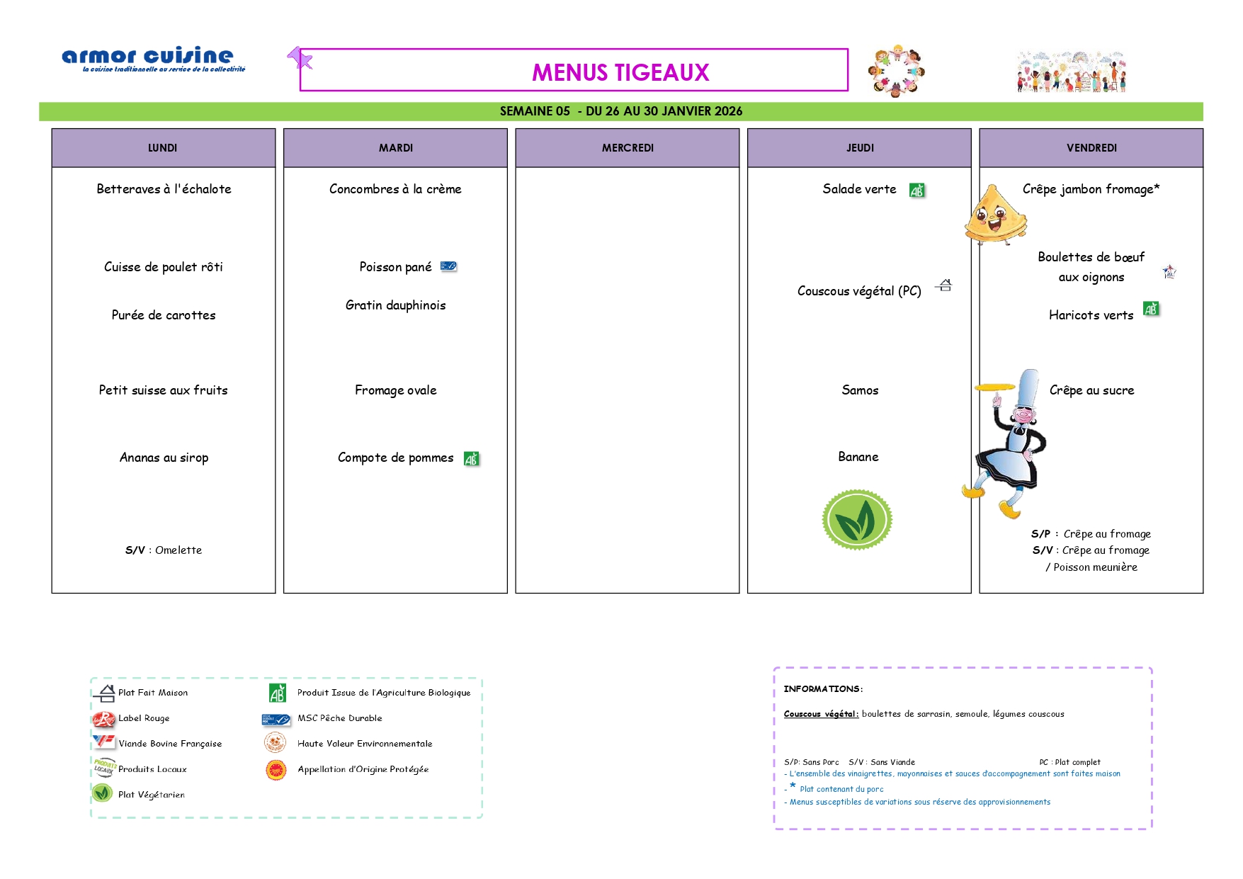 La fourniture des repas est assurée selon le principe de la liaison froide par un prestataire extérieur qui livre quotidiennement des plats nutritionnellement équilibrés.